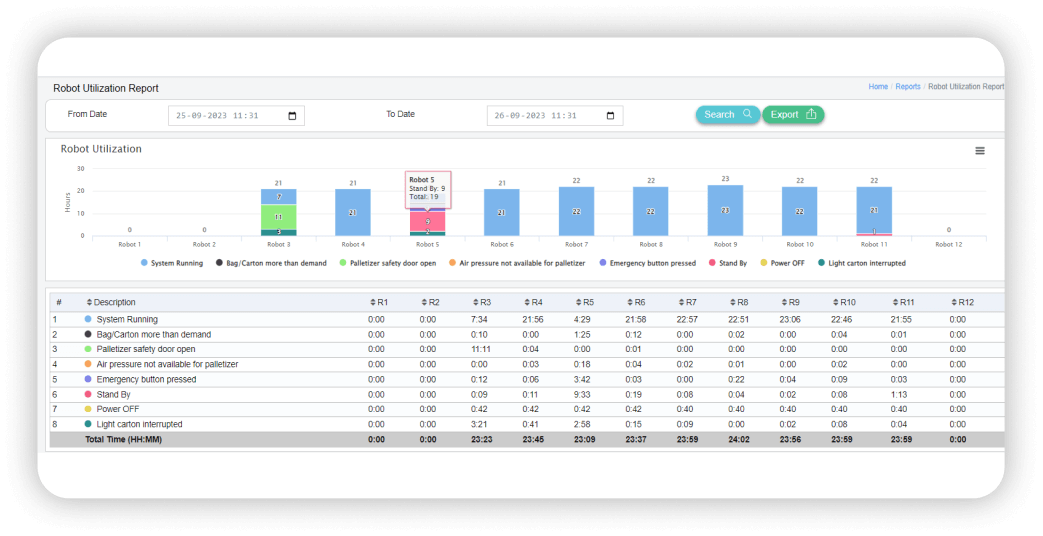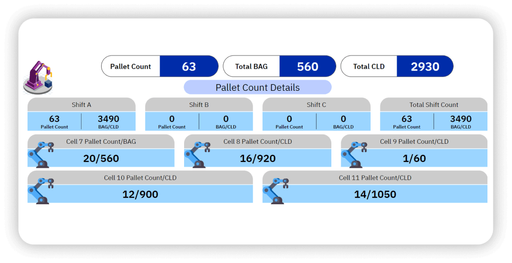 In case of a breakdown, we provide a manual palletization area soon after the customer’s machine. When a portion of the system breaks down, such as when 1 out of 5 robotic palletizers is down, you can still run the remaining 4 in production.